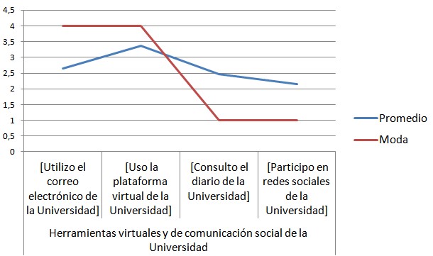 Como se puede observar los alumnos utilizan asiduamente la plataforma virtual y el correo de la universidad con unos promedios respectivamente de: 3,3 y 2,6 sobre 4. En la Figura 7 mostramos la evolución del promedio con respecto a las herramientas virtuales y de comunicación social en la Universidad.