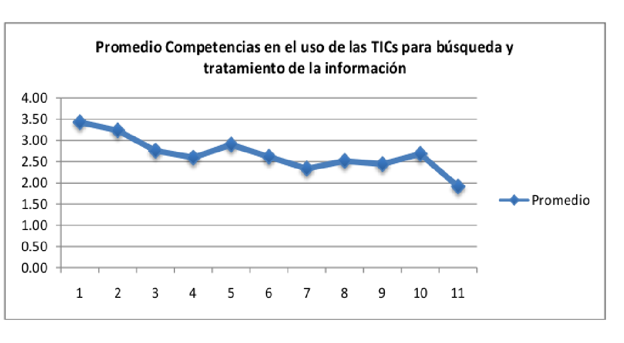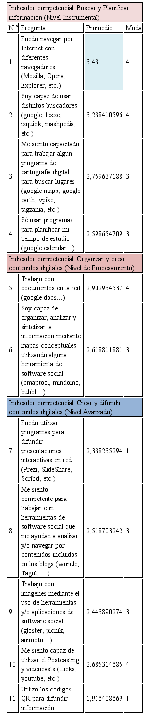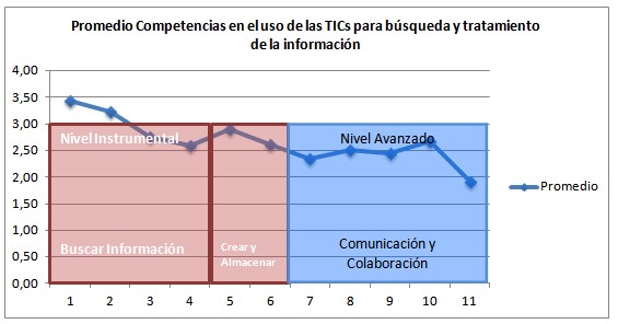 Podemos observar que las preguntas: 7-11 se pueden definir como “competencias avanzadas” relacionadas con los campos de la comunicación y colaboración (ALA-MUTKA, 2011). En estas competencias los estudiantes obtienen promedios más bajos: