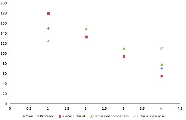 El gráfico de dispersión (Figura 6) muestra cómo la ayuda de pares (Hablar con compañeros) es la acción más probable cuando se quiere resolver dudas relacionadas con el empleo de recursos tecnológicos entre el alumnado consultado.