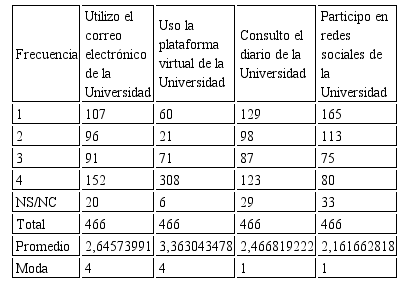 Los resultados de los estadísticos descriptivos de las principales herramientas virtuales y de comunicación social en la Universidad se muestran en la Tabla 2.