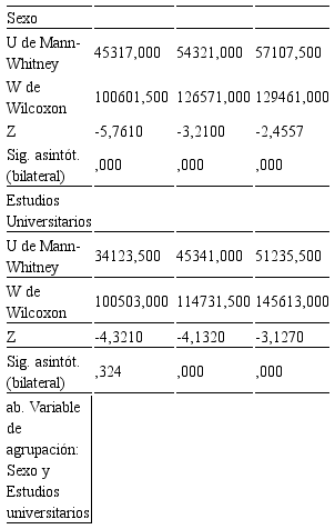 Como podemos observar, las tres dimensiones siguen una distribución no normal por lo que hemos realizado sucesivas pruebas U de Mann-Whitney (Tabla 4) para comprobar si existen diferencias significativas en el sexo de los encuestados por dimensiones y en el tipo de estudios universitarios agrupados por estudios en dos categorías: “Ciencias” (Ingeniería en Administración de Empresas