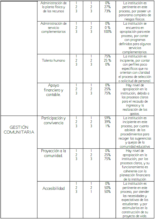 Y en cuanto al área de gestión comunitaria la institución resultó estar en la fase de “incipiente” en este proceso, por cuanto adolece de los procedimientos para recoger las sugerencias y quejas de la comunidad educativa; no contar con políticas de interacción con los padres de familia y no hacer seguimiento y evaluación a los programas y proyectos interinstitucionales. Todo esto a pesar de tener unos mecanismos definidos de participación de los padres en el proceso de aprendizaje de los estudiantes y la de contar con una aceptación social por su labor con un 59%, para el nivel 1, y un 39%, para el nivel 2, y un 1%, para el nivel 3.