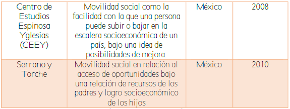 Existen diversas posturas y planteamientos en términos del concepto de movilidad social, sin embargo, la tabla I muestra únicamente algunas de las posturas establecidas para dar idea de lo que se ha trabajado, bajo qué visión, en dónde y el año de estudio, ya que retomar toda la literatura existente en este trabajo implicaría omitir algunos otros aspectos relevantes de precisar.