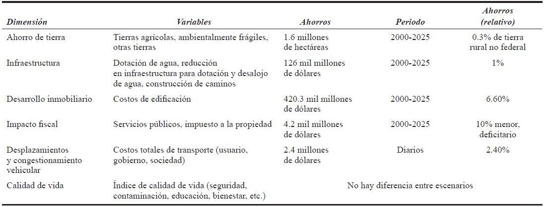 La conclusión central de Burchell et al. (2005) es que la expansión urbana es más costosa que el crecimiento compacto, aun si la calidad de vida (tal como se analizó en su modelo) es similar en ambos escenarios. Evaluado en términos económicos, el crecimiento compacto es preferible a la expansión urbana desde una perspectiva social.