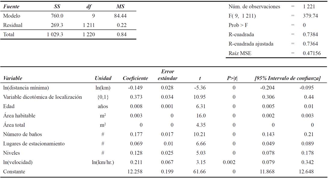 La matriz X contiene información de las características de la vivienda: su antigüedad (en años), el área habitable (en metros cuadrados), el área total del inmueble (en metros cuadrados), el número de baños, el número de lugares de estacionamiento y el número de niveles; estas características se consideraron esencialmente por la información que se tenía disponible en la fuente de información utilizada. El modelo también incluye variables relacionadas con la accesibilidad de las viviendas en la muestra: la distancia al centro de transporte más cercano (logaritmo de la distancia en kilómetros), la velocidad promedio hacia el centro de transporte más cercano (logaritmo de la velocidad en kilómetros por hora) y una variable que identifica si la vivienda se ubica en la Ciudad de México o en el Estado de México.