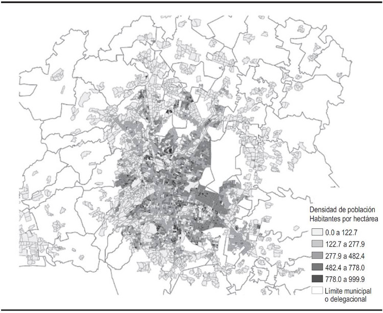 De acuerdo con Gillhan, las áreas de expansión urbana suelen tener menores densidades de población, empleo y viviendas. En la ZMVM, como es de esperarse, la densidad de población es mucho menor en la periferia que en el centro, en una proporción de hasta diez veces. Sin embargo, considerando el caso específico de los grandes conjuntos habitacionales de reciente construcción, la densidad de viviendas es mucho más alta que la de los pueblos originales en donde se desarrollaron (véase el mapa 2).
