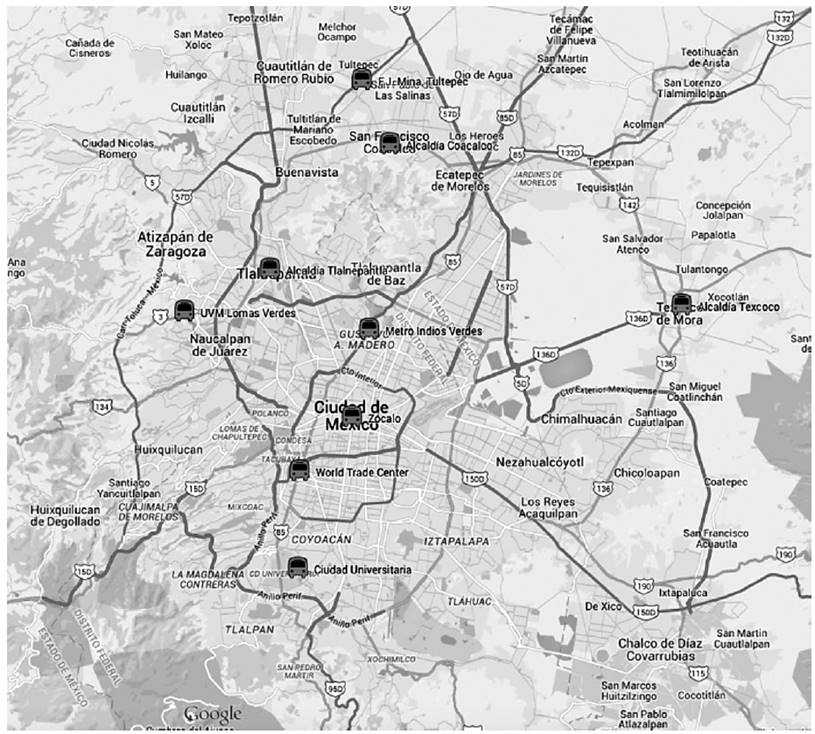 Posteriormente, se consultó la Encuesta Origen-Destino que levantó el Instituto Nacional de Geografía y Estadística en 2007. La encuesta identifica los destinos de mayor afluencia en la zona metropolitana, y para términos de este ejercicio, se tomaron los principales nueve destinos que se muestran en el mapa 3. Como la encuesta reporta los distritos de destino, se establecieron los puntos que dentro de ellos serían destinos plausibles de transporte público, tales como los Centros de Transferencia Modal (Cetram), las estaciones del Metro o algún centro importante de negocios y comercios. En el ejercicio se considera que el trabajador que llega a un Cetram desde una localización periférica se encuentra, a partir de ese momento, en igualdad de condiciones que un habitante intraurbano, en términos de desplazamiento.
