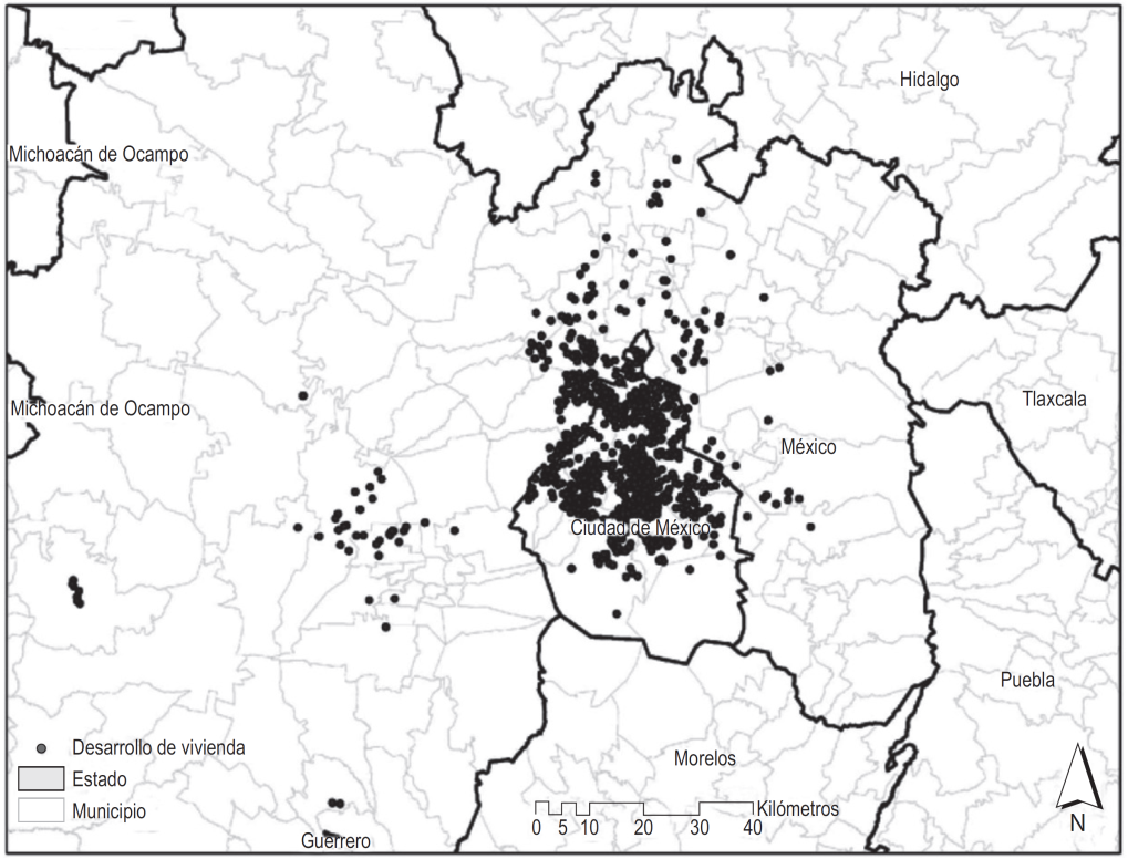 Una idea de la magnitud de su contribución al fenómeno de la expansión urbana la dan Duhau y Giglia (2008), quienes estiman que en la ZMVM se construyeron entre 1994 y 2005 un total de 371 422 viviendas en 115 conjuntos urbanos de interés social y social progresivo. Estos conjuntos cubrieron una superficie de 6 383 hectáreas, las cuales llegaron a representar el 3.6% de la superficie urbanizada en el año 2005.2 A esta superficie podrían añadirse las áreas cuya transición a suelo urbano se indujo tras la implantación de los conjuntos de vivienda.
