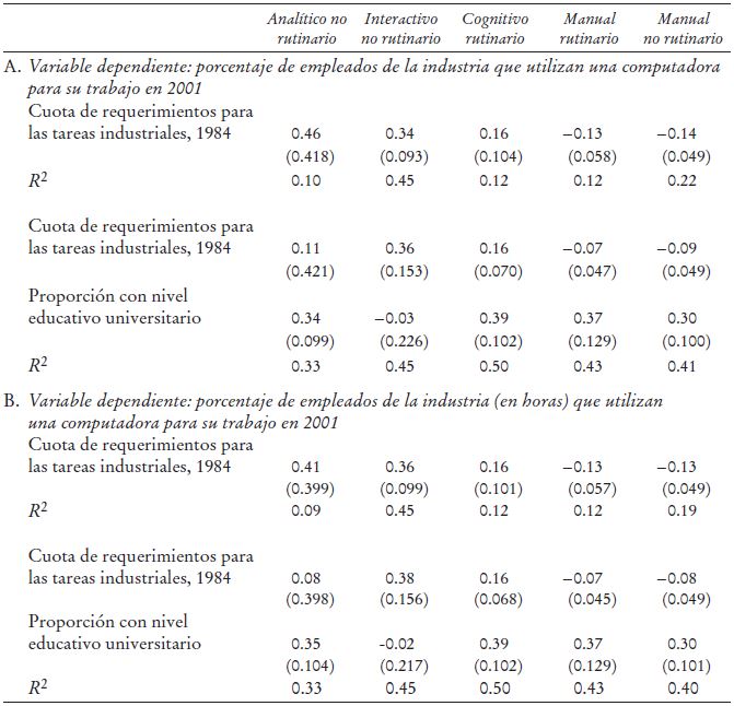 En el Cuadro 2 se presentan los resultados de la estimación de la Ecuación (4). Dicho cuadro contiene dos paneles: en la parte superior presentamos las estimaciones obtenidas al utilizar una medida de intensidad de las tareas sustentada en el número de empleados con determinada ocupación, y en la parte inferior medimos la intensidad de las tareas teniendo en mente las horas totales de todos los trabajadores dedicados a esa ocupación. Tal como se esperaba, todos los coeficientes salvo uno (el manual rutinario) cuentan con el signo correcto, y una vez que tenemos bajo medición la cuota de trabajadores con un nivel educativo universitario que están en la industria, tres coeficientes tienen el signo relevante correcto (a pesar del pequeño número de industrias), el coeficiente manual rutinario se vuelve estadísticamente no significativo y el coeficiente manual no rutinario tiene el signo casi relevante correcto. Estos resultados implican que nuestra clasificación de las tareas es congruente con la clasificación de Autor, Levy y Murnane (2003).