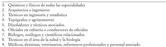 En el primer grupo -DCP- se clasificaron las ocupaciones en las que se llevan a cabo tareas con un componente analítico y administrativo de alto grado, como la responsabilidad de dirigir empresas o instituciones. En el segundo grupo -MATH- se clasificaron las tareas en las que se requiere sobre todo el razonamiento cuantitativo, por ejemplo las ocupaciones asociadas con la ingeniería, la medicina o la economía. El tercer grupo -STS- comprende tareas cuyo principal requisito es la habilidad de adaptarse a empleos donde es necesario fijar límites, zonas de tolerancia o estándares. El cuarto grupo -Finger- incluye las tareas en las que sobresalen el componente rutinario y la destreza manual. En el último grupo -EHF- se encuentran las tareas que a la vez exigen un alto grado de destreza manual y son de carácter no rutinario, en las que tiene un papel importante la coordinación ojo-mano-pie, como las que desempeñan los empleados domésticos y los camioneros o taxistas.