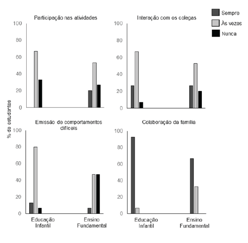 Distribuição percentual dos estudantes da Educação Infantil e do Ensino Fundamental em relação à participação nas atividades propostas para a turma, interação com os colegas, emissão de comportamentos difíceis e colaboração da família.