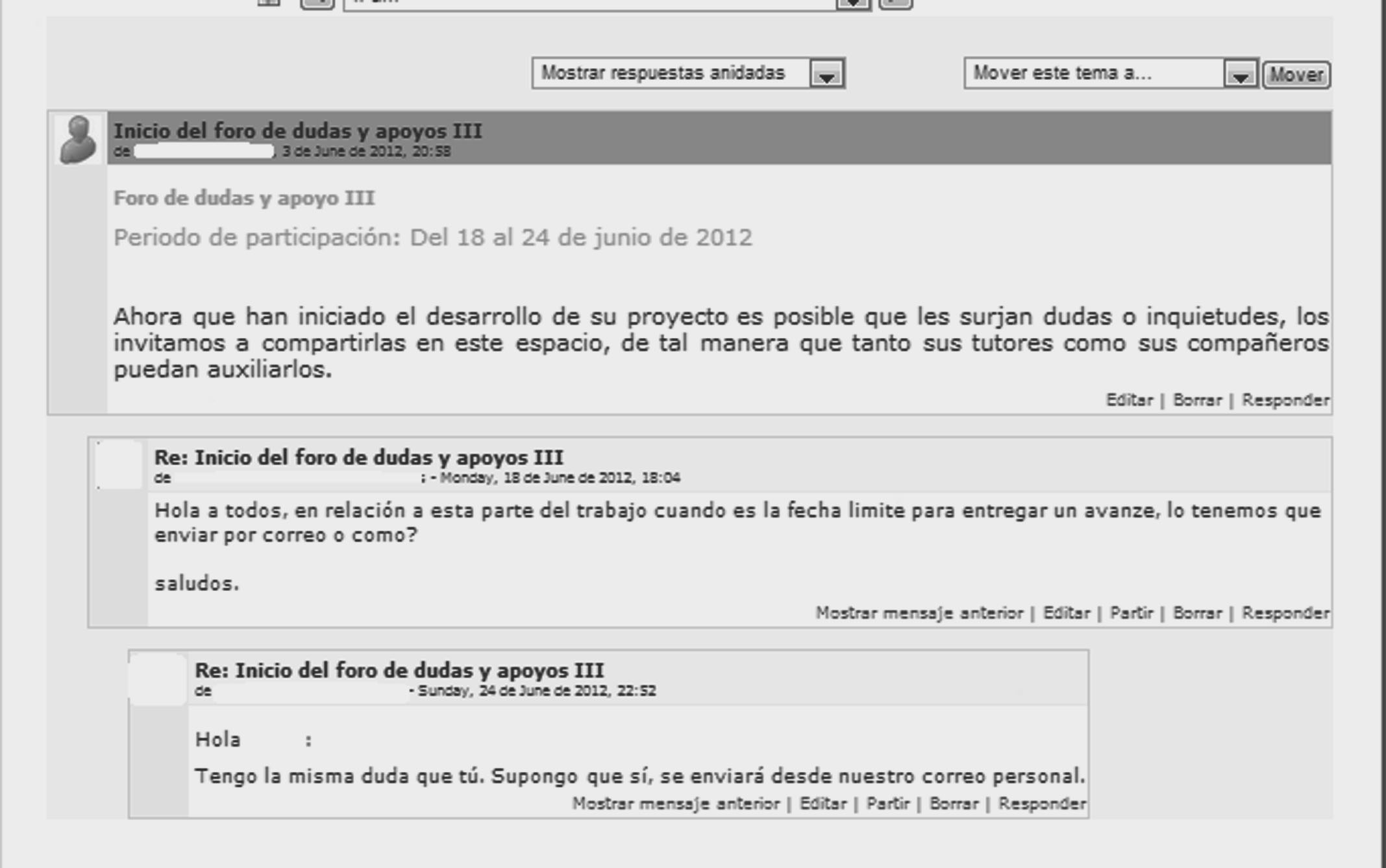Véase la siguiente imagen que registra una actividad en foro, en el que no existe la interactividad, ya que se registran sólo tres participaciones: