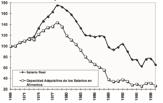 El largo período de dificultades económicas generó un amplio proceso de empobrecimiento y de exclusión social de vastossectores de la población. En los períodos en que se agudiza el deterioro social, tras cada crisis económica, se instrumentaron medidas para mitigar sus efectos y combatir la pobreza. Sin embargo, en todos los casos éstas han resultado insuficientes para contener los efectos de la dinámica económica. La capacidad adquisitiva de los salarios se deteriora gravemente a partir de la década de los ochenta. En 1999 los salarios reales representan sólo el 40% de los existentes en 1980 y su capacidad adquisitiva en alimentos registra incluso un nivel más bajo. El proceso continuó al menos hasta 2003, cuando las remuneraciones de los trabajadores, en términos reales, se ubican en menos del 70% de las recibidas en 1997. (HERNÁNDEZ, [2006], p. 11).