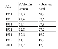 En la Tabla 1 se puede ver que, en gran medida como consecuencia del surgimiento de la industria del petróleo, Venezuela prácticamente vació sus campos en el que es probablemente el proceso de urbanización más acelerado y más intenso de América Latina puesto que entre 1941 y 2001 (60 años) su población rural descendió de 68,7% a apenas un 12,3%, es decir un descenso de 60%, mientras que su población urbana creció en el mismo período de 31,3% a 87,7%, es decir casi un 60%. Este proceso no se he detenido y hoy (2016) Venezuela tiene una población urbana, altamente concentrada en unas ocho grandes ciudades, de aproximadamente 96%, lo que significa que apenas un 4% de la población es rural.