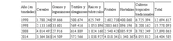 Los resultados del aumento del producto agrícola agregado, debido a las dificultades estructurales mencionadas, fueron insuficientes para eliminar la dependencia de las importaciones, con la complicación adicional de que, debido a las políticas redistributivas y el aumento de la oferta de alimentos subsidiados, le demanda ha continuado sobrepasando la oferta agregada. Por ello, pese a que la producción nacional de alimentos que incluye productos agrícolas, animales y pescados, se incrementó de 13 millones de toneladas en 1998 a 25 millones en 2013, el consumo de alimentos de primera necesidad que, en 1999 había sido de casi 14 millones de toneladas, ya en 2012 superaba las 26 millones de toneladas. La Tabla 2 nos muestra el crecimiento de la producción agrícola por rubros al comparar los años 1998 y 20143, y es de notar que entre 1990 y 2008 la producción agrícola total creció en un tercio.