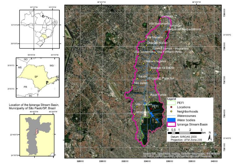 As a case study, the Ipiranga Stream Basin, located in the South Zone of the Municipality of São Paulo, will be portrayed as it suffers from flooding annually. Its approximate length is 11 km and its contribution area corresponds to 23 km². Of this total, about 80% is urbanized and the remaining 20% is represented by the remaining Atlantic Forest of the Fontes do Ipiranga State Park (PEFI), where a large portion of the springs of Ipiranga Stream is located (Figure 1).