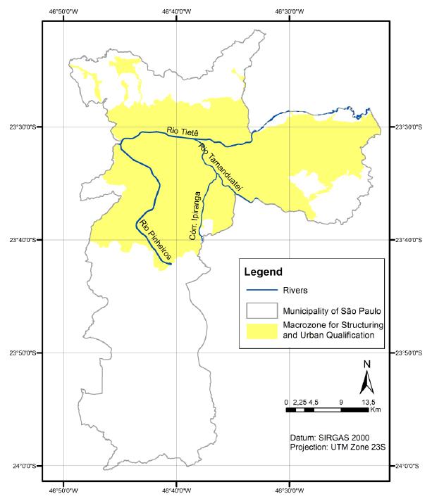 The Strategic Master Plan for the Municipality of São Paulo, Municipal Law nº 16.050/2014 (SÃO PAULO - CIDADE, 2014) provides objectives and strategies for spatial planning for homogeneous areas defined as macrozones and macro-areas. The Urban Structuring and Qualification Macrozones encompass most of the urbanized area, and the fluvial plains of the Tietê, Pinheiros and Tamanduateí rivers, of which the Ipiranga Stream is an affluent (Figure 2). Among the general objectives of this area, Art. 10, § 2, I stand out: