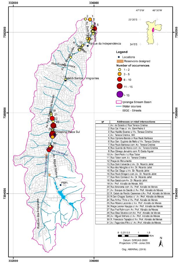 For data collection, the digital collections of the newspapers Ipiranga News, Jabaquara News, Folha de São Paulo and the State of São Paulo were consulted, in addition to the institutional data obtained from the Emergency Management Center of the City of São Paulo (CGE/PMSP) and the São Paulo State Flood Alert System, Department of Water and Electricity, Fundação Centro Tecnológico de Hidráulica (SAISP / DAEE / FCTH). The data were tabulated on a standard form, adapted from IG (2009). After statistical analysis, the locations were inserted on the map of the location of the flood points, identified at 31 addresses or road intersections (Figure 5).