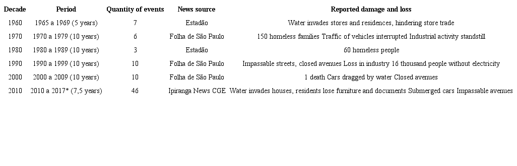 According to the data survey carried out by Santos and Amaral (2017), 82 flood events were recorded in the basin in the period stretching from 1965 to 2017, which amounts to 52 years. Thus, on average, more than one flood per year occurred in the area of the Ipiranga Stream Basin. No news was found prior to 1965, since there was no urban occupation on the banks of the stream.