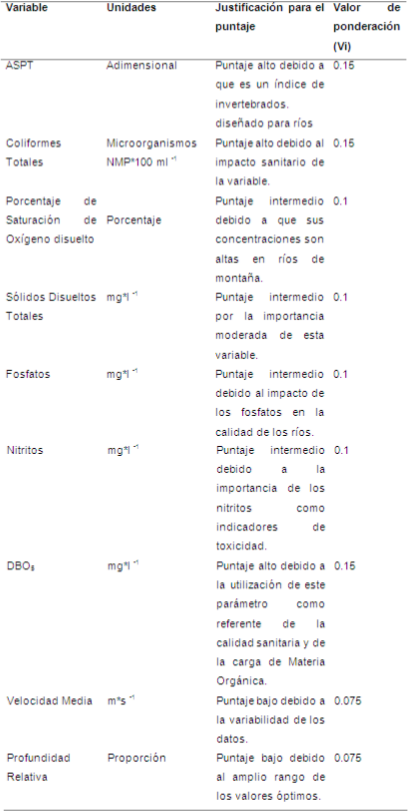 Mediante el programa Curve Expert 1.4 © (Hyames, 2013) se construyeron curvas de calidad para cada una de las variables seleccionadas. Este programa permitió seleccionar el modelo de regresión de Sperman que más se ajustó a la distribución de los valores. Además proporcionó la ecuación y el valor de los coeficientes o constantes necesarios para calcular el índice para cada río. En este caso se seleccionaron los modelos con un coeficiente de correlación >0,90. Las curvas de calidad para cada parámetro tuvieron una escala que fluctuó entre 0 y 1 (0= baja calidad y 1= alta calidad). De esta manera, dado un determinado valor de un parámetro, se puede obtener en la curva de calidad sus correspondientes subíndices de calidad (Ci). Los factores de ponderación (Vi) para cada variable se establecieron basados en estudios limnológicos y de calidad de aguas (Ramírez y Viña, 1998) y en el grado en que cada variable podría afectar o reflejar el funcionamiento de los ríos de montaña (Donato, 2008).