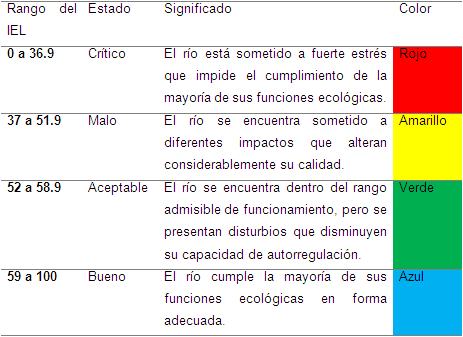 Para el IELf se definieron cuatro escalas de calidad hídrica (ver Tabla 2). Cada categoría de clasificación (crítico, malo, aceptable y bueno) se relaciona con la capacidad que tiene el río para cumplir con sus servicios ecológicos, ambientales y sanitarios. Esto incluye servicios ecosistémicos de uso directo como la disponibilidad de agua para la producción de alimentos y para la generación de energía, de uso indirecto como la regulación del clima, la intervención en los ciclos de los gases de efecto invernadero, la amortiguación de las perturbaciones hidrológicas, el reciclaje de nutrientes (depuración del agua), el tratamiento de materiales (sedimentos, materiales orgánicos) y servicios de opción como los usos culturales y turísticos (Elosegi y Sabater, 2009).