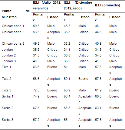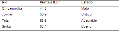 Verificación y validación del Índice de Estado Limnológico Fluvial Posteriormente se verificó la aplicabilidad del IELf, para lo cual se utilizó en la evaluación de la calidad hídrica en dos corrientes de la cuenca alta del río Chicamocha (ríos Sotaquirá y Chiticuy), diferente a las utilizadas para la construcción del índice. Los resultados de este ejercicio se presentan en la Tabla 5. La comparación de los resultados del IELf de los sitios estudiados con los datos que arrojan otros índices de calidad, internacionales y colombianos, se muestran en las Tablas 6 y 7, respectivamente.