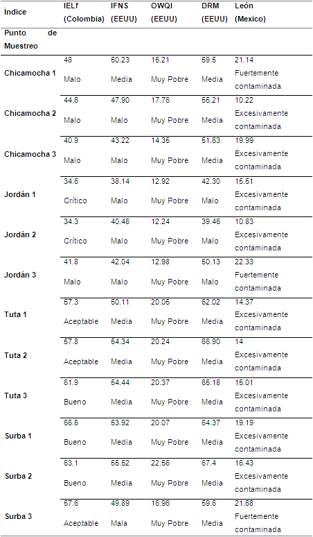 Los resultados obtenidos con el IELf se compararon con la calidad establecida mediante algunos ICAs internacionales, como el IFNS (Índice de la Fundación Nacional de Saneamiento) (Brown et al., 1970), el OWQI (Índice de Calidad del Agua de Oregón) (Dunnette, 1979), el DRM (Índice para el río Des Moine) (Kahler-Royer, 1999) y el índice León (Índice para cuenca Lerma-Chapala) (León-Vizcaino, 1988). También se hicieron comparaciones con los ICAs colombianos propuestos por Ramírez et al. (1997), denominados ICOMI (Índice de contaminación mineral), ICOSUS (Índice de contaminación de sólidos suspendidos), ICOMO (Índice de contaminación por materia orgánica) e ICOpH (Índice de contaminación por pH).