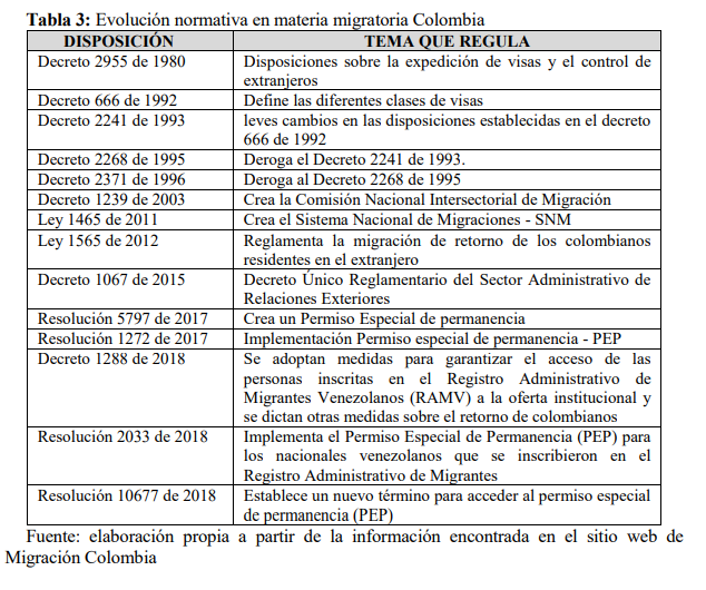 Tabla 3: Evolución normativa en materia migratoria Colombia