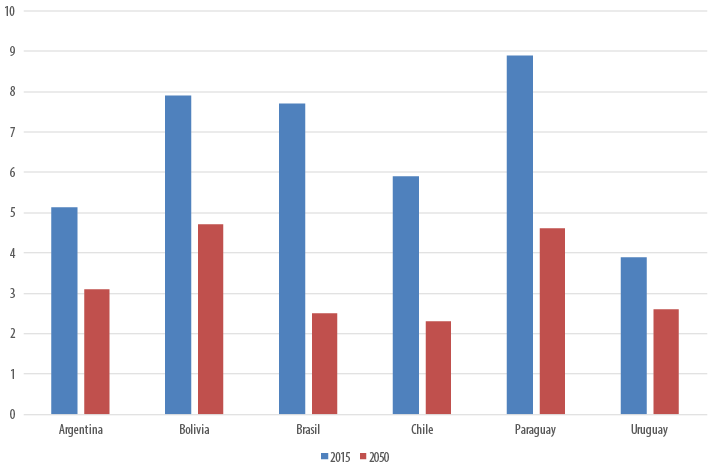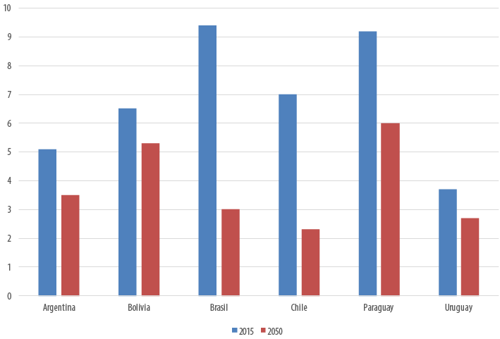 El Gráfico 2, por su parte, muestra la evolución de la tgf para los países del Cono Sur durante el mismo período (1950-2050):