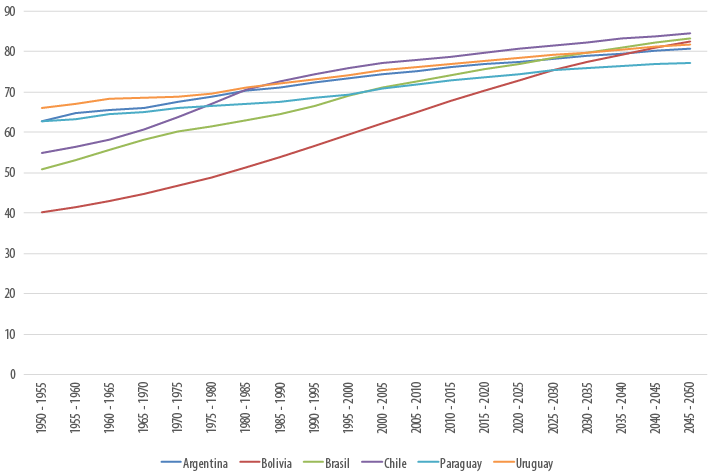 El Gráfico 3 muestra la evolución de la esperanza de vida al nacer para los países del Cono Sur durante el mismo período (1950-2050). Allí puede observarse un proceso de convergencia. Un caso particularmente destacable es el de Bolivia, que incrementa sustancialmente la esperanza de vida al nacer en el período, para alinearse con el resto de los países de la región.