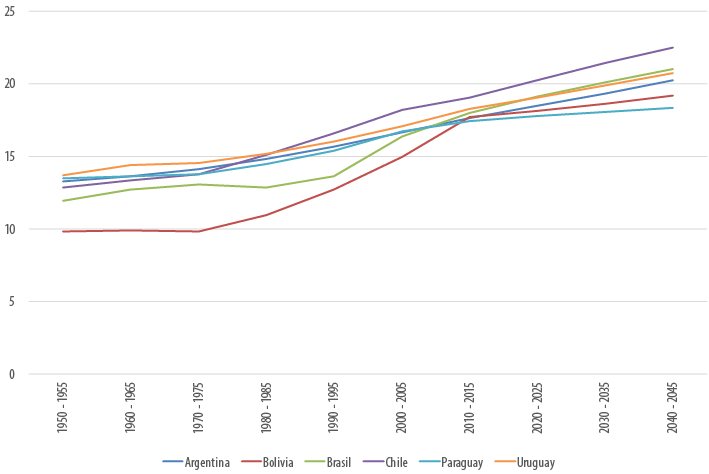 Todos los países registran desde el año 2000 un aumento exponencial del índice, pero a ritmos muy heterogéneos: Brasil y Chile registran las mayores tasas de envejecimiento mientras que, desde dicho año, el ritmo de envejecimiento de Uruguay es intermedio y, tanto Argentina como Bolivia y Paraguay, registran los incrementos (exponenciales) menos acentuados.