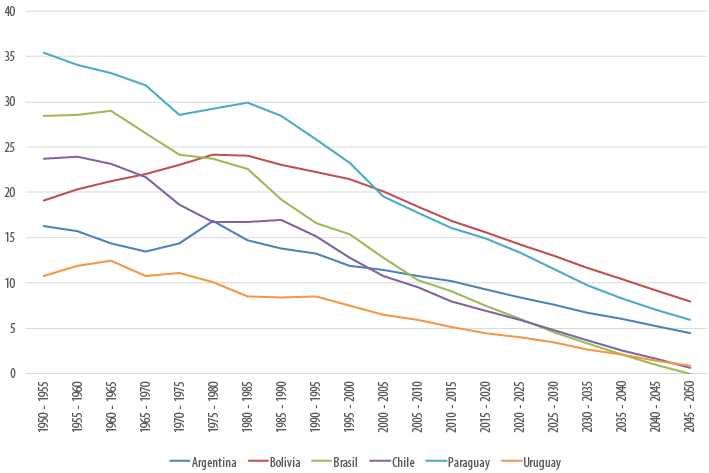 Argentina y Uruguay registran tgf al inicio de la serie muy inferiores a los demás países (cercanas a tres hijos por mujer), mientras que Bolivia, Paraguay y Brasil, las tgf más elevadas (todas superiores a seis hijos por mujer). Chile, por su parte, inicia la serie en un nivel intermedio, aunque elevado (cinco hijos por mujer).