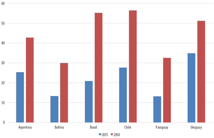 Dado el menor ritmo de crecimiento del índice para Uruguay y Argentina desde el año 2000, estos países dejarían de liderar el ranking. El caso de Argentina es especialmente notorio, ya que en 2050 quedaría muy por debajo de Chile, Brasil y Uruguay.