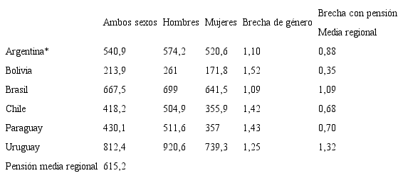 Para tener en cuenta la calidad diferencial de las pensiones en los países analizados, se calculó una pensión media regional considerando la información proporcionada en el Panorama social de América Latina de 2017 (cepal, 2017). En la Tabla 1 se presentan datos de las pensiones mensuales promedio percibidas y de la brecha de género que presentan dichas pensiones.