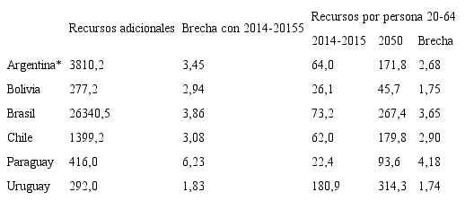 En el segundo escenario, se observa que tanto Bolivia como Paraguay deben multiplicar por más de ocho los recursos mensuales destinados a las pensiones, debido principalmente al incremento en la calidad de la protección que demanda aproximarse al nivel regional medio de pensiones. En el otro extremo, Uruguay solo debe incrementar en 40% los recursos destinados. Al hacer el análisis por persona de veinte a 64 años, Chile, Bolivia y Paraguay son los que mayores esfuerzos per cápita deberían hacer, mientras Uruguay es el que menos. Esto se explica por el hecho de que, en dicho país, proporcionar pensiones equivalentes a la media regional supondría reducir los niveles actuales de protección y, además, que reportará menor incremento relativo de personas mayores. De todas formas Chile, Brasil y Uruguay son los que, en términos absolutos, debieran realizar un mayor aporte per cápita.