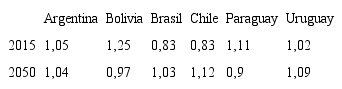 Brasil y Chile (los países con proporción más alta de mayores al final de la serie) llegan a los niveles de tgf más bajas: 1,63 (Brasil) y 1,73 (Chile).