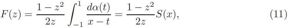 and then dσ(θ) + dσ(2π − θ)=0. Thus, there exists a simple relation between the Stieltjes function (the real line analog of the Carathédory functions, given by S(x) =∑∞n=0 µnx−(n+1), where {µn}n≥0 are the moments associated with the measure on the real line) and the Carathéodory function associated with α and σ, respectively, given by (see [9])