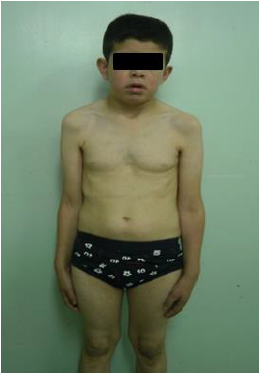 Examen físico: realizado a los 10 años de edad. El peso: 25 kg (P 10-50) SDS -0,9, la talla: 130 cm(P 10-50) SDS -1,0 y el perímetro cefálico: 47,5 cm (P<3). Microcefalia con facies peculiar caracterizada por hendiduras palpebrales dirigidas hacia abajo y afuera ehipoplasia malar. La nariz es deprimida, con raíz alta, puente ancho y narinas ante vertidas. El filtrum es convexo, presenta asimetría labial con comisur aslabiales hacia abajo y el paladar es ojival (figura 1). Los pabellones auriculares rotados posteriormente en asas. Los genitales normo configurados, en escroto se evidencia cicatriz del lado derecho por orquidopexia. La piel es laxa, reticulada y seca, al estirarse regresa lentamente (figura 2). Presenta genu valgum, equimosis en rodilla, ausencia de arcos planta resbilaterales, talo varo e hipoplasia bilateral de uñas del primer dedo del pie. La escala Beighton: 3 puntos, caracterizados por hiperextensión de ambas rodillas mayor a 10 grados (2 puntos), flexión del tronco hacia adelante con las rodillas extendidas y palmas descansando en el suelo (1 punto). Marcha con apoyo sobre los bordes internos plantares. A nivel neurológico se muestra atento y colaborador, con lenguaje parco, dislálico y de pobre contenido, mostrando además rendimiento intelectual por debajo de la norma. Presenta hipotonía generalizada con ángulos de flexión articular amplios, signo de bufanda positivo con aproximación posterior de codos facilitada, bamboleo manual, signo de rana positivo. Los reflejos osteo articulares dentro de la normalidad y la sensibilidad se encontró conservada.
