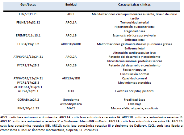 La cutis laxa (CL) es un trastorno infrecuente de la piel que se caracteriza por ser redundante, inelástica y con un aspecto precoz de envejecimiento. De presentación local o generalizada, puede mejorar con el tiempo en algunos de los afectados. Se asocia además con la afectación variable de otros órganos que interviene en su diagnóstico y pronóstico. Puede ser de forma heredada o adquirida. En la primera se presenta una amplia heterogeneidad locus como se muestra en la tabla 1, y son de aparición congénita. Los estudios de las formas hereditarias de la CL han puesto al descubierto una red cada vez mayor de genes necesarios para biogénesis de la fibra elástica en la matriz extracelular e implicados en el mantenimiento homeostático de este importante componente integral del tejido conectivo dérmico (1-4). El diagnóstico histopatológico y ultra estructural en piel evidencia escasez, desorganización y fragmentación de las fibras elásticas (1).