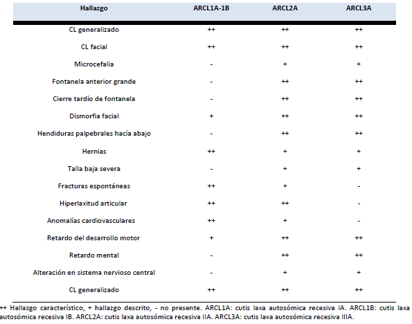El espectro clínico de los síndromes de CLautosómicos recesivos son muy heterogéneos con respecto a la pleiotropía y su gravedad, (tabla 2). Uno de los principales criterios diagnóstico es detectar las fibras de elastina anormales. Sin embargo, las anomalías histológicas clásicas pueden estar ausentes, por lo que puede verse dificultado su diagnóstico (7).Además, es genéticamente muy heterogénea, como se muestra en la tabla 1.