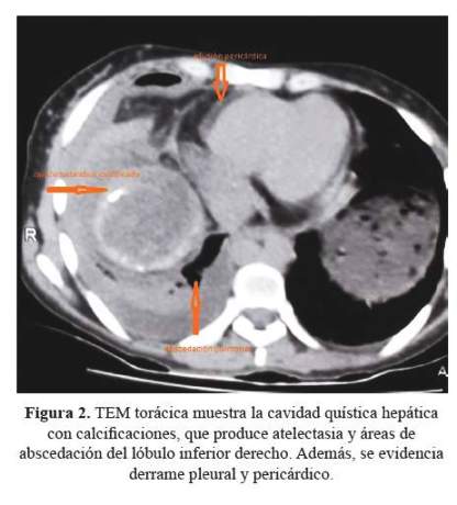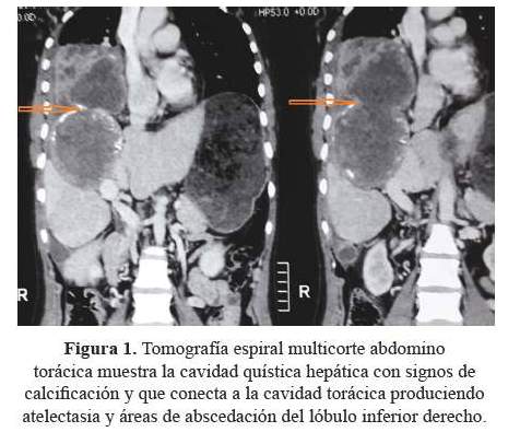 El objetivo de este reporte, fue describir el caso de una paciente con quiste hidatídico hepático con ruptura abrupta hacia el tórax; revisar su presentación clínica, la presencia de fístula bilio bronquial y el compromiso pulmonar y pericárdico, los métodos diagnósticos utilizados y el manejo médico-y quirúrgico multidisciplinario de esta patología de alta morbi-mortalidad.
