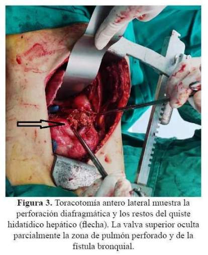 El abordaje fue por toracotomía antero lateral procediéndose a la evacuación de líquido inflamatorio a nivel pleural; luego, se procedió a abordar la cavidad creada entre el quiste hepático y el lóbulo inferior derecho, una colección serofibrinosa. Se ubicó la fístula bronquial a nivel del hilio y se procedió a su cierre, luego se procedió a la rafia del lóbulo inferior derecho que se encontraba perforado y comunicaba los segmentos inferiores al segmento apical (segmento 6), dado que el diafragma estaba perforado se procedió a evacuación del quiste hidatídico hepático complicado y posteriormente se procedió a cerrar el diafragma con sutura no reabsorbible (figura 3). Se colocaron dos drenes torácicos y un dren de Jackson Pratt a nivel de cavidad quística hepática.
