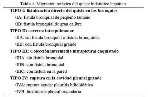 El contacto íntimo del quiste hidatídico hepático con el diafragma favorece el cruce de la barrera diafragmática con ruptura de estos quistes en la pleura o en un lóbulo pulmonar. Así, el tránsito intratorácico de estas lesiones depende de varios factores: el contacto íntimo del quiste en la cúpula hepática con la cúpula diafragmática; la gradiente toraco-abdominal que tiende a aspirar el contenido del quiste hidatídico del hígado hacia la cavidad torácica; la erosión del diafragma por isquemia-necrosis causada por la posible superinfección del quiste y los fenómenos inflamatorios, y la corrosión de todos los tejidos en contacto con la bilis (8).