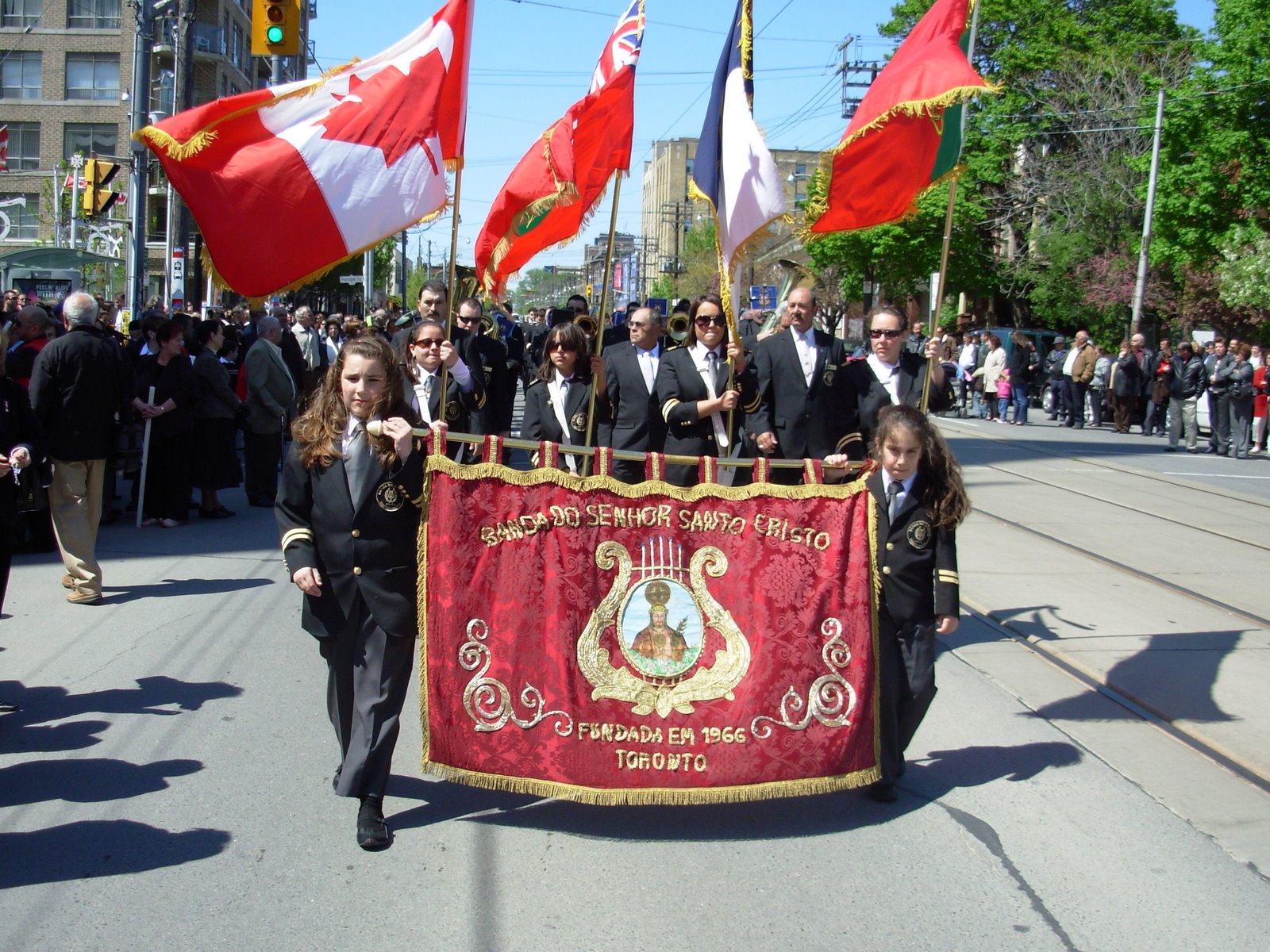 A foto abaixo mostra a “linha de frente” da Banda do Senhor Santo Cristo, banda filarmônica portuguesa mais antiga do Canadá, na procissão do Senhor Santo Cristo dos Milagres. Podemos observar o estandarte da banda, em primeiro plano, carregado por duas crianças uniformizadas com os mesmos trajes dos músicos. No estandarte constam o nome da banda, o ano de sua fundação e a localidade à qual ela pertence, a cidade de Toronto. Também podemos observar, ao centro do estandarte, uma lira, representando a música, e, no seu interior, a imagem do Senhor Santo Cristo. Logo atrás, da esquerda para a direita, podemos visualizar as bandeiras do Canadá, da Província de Ontário, da qual Toronto é a capital, da Região Autônoma dos Açores e, por fim, a bandeira de Portugal. Logo a seguir, atrás das bandeiras, vêm os diretores da banda, o maestro e a banda de música.