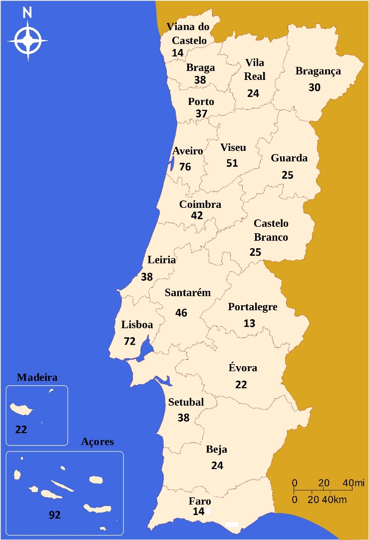Apresentamos, abaixo, um mapa com a distribuição das Bandas Filarmônicas por Distrito, em Portugal, e também nos Arquipélagos dos Açores e da Madeira.