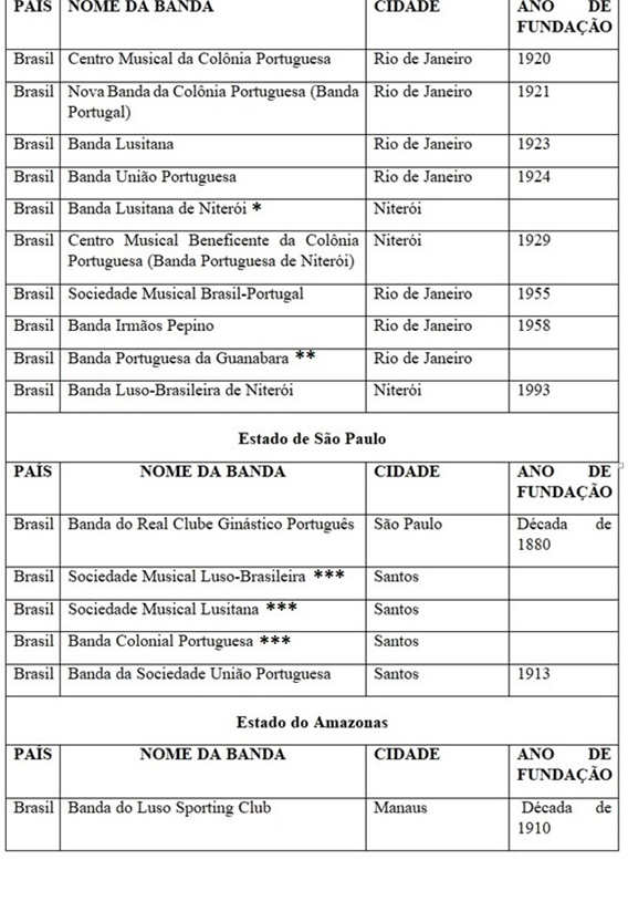 Apresentamos abaixo um quadro contendo as bandas filarmônicas portuguesas identificadas no Brasil através de pesquisa em periódicos. Este quadro, dividido por estados, apresenta o nome da Banda, a cidade onde foi fundada e, quando foi possível identificar, o ano ou período de sua fundação.