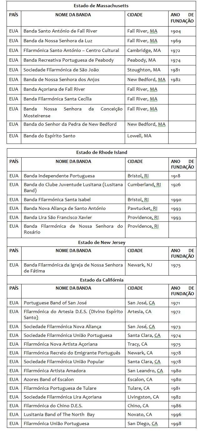 Apresentamos abaixo um quadro contendo as bandas filarmônicas portuguesas catalogadas nos Estados Unidos. Este quadro, dividido por estados, apresenta o nome da Banda, a cidade onde ela está sediada e, quando foi possível identificar, o ano de sua fundação.