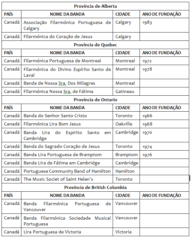 Abaixo, apresentamos um quadro contendo as bandas filarmônicas portuguesas catalogadas no Canadá. Este quadro, da mesma forma que os quadros anteriores, referente às bandas Filarmônicas portuguesas no Brasil e nos Estados Unidos, está dividido por províncias, denominação adotada no Canadá e equivalente ao estado no Brasil, apresentando o nome da Banda, a cidade onde ela está sediada e, quando foi possível identificar, o ano de sua fundação.