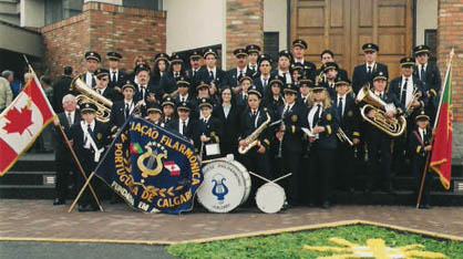 Na foto acima, da Associação Filarmónica Portuguesa de Calgary, podemos observar, à esquerda, a bandeira da banda com uma lira ao centro, simbolizando a música, circundada pelas bandeiras de Portugal e do Canadá. O uniforme da banda reflete a influência das bandas militares como observamos anteriormente nas bandas filarmônicas em Portugal.