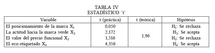 En la comprobación de las hipótesis (Xi -Y) se utilizó el estadístico ‘t’ para la prueba de dos colas, el cual tiene establecido como límite inferior a 1,96 (Hair et al., 2013) para un nivel de confianza del 95%. El estadístico permite identificar las variables que son significativas sobre la variable dependiente y por consecuencia conocer el impacto del respectivo análisis. De acuerdo con Anderson et al. (2012) la representatividad de las variables latentes sobre la variable dependiente es a través de comparar la ‘t’ teórica (valor de 1,96) con el resultado de la ‘t’ práctica. Al realizar dicha comparación, se puede notar que el valor de la ‘t’ práctica es menor que la ‘t’ teórica en cada una de las variables de estudio, a excepción de la relación entre X4 -Y (Tabla IV).